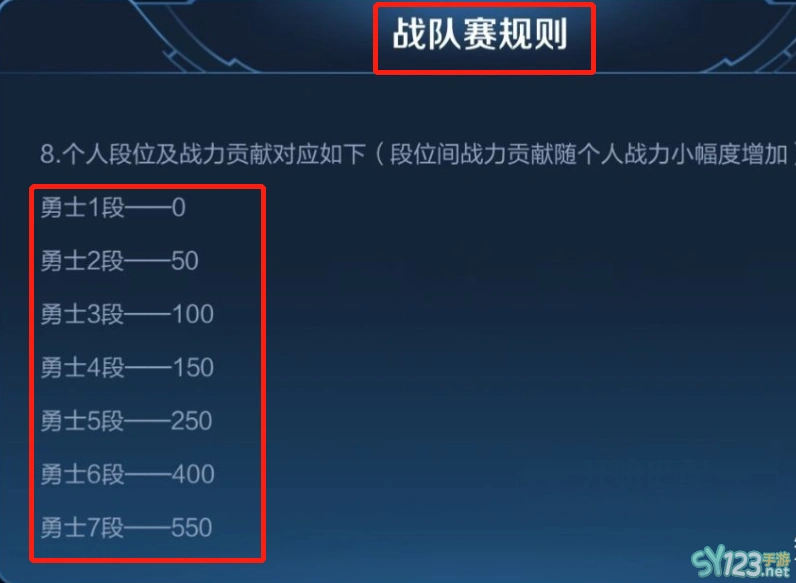 第一首先在王者荣耀战队赛规则中赢一把是看玩家段位决定的,这个段位一共分为7段,如勇士1段就是加成0战力,勇士2段加成50战力最后勇士7段达到高于550,其次就是段位间战力贡献是随玩家战力小幅度增加的。
