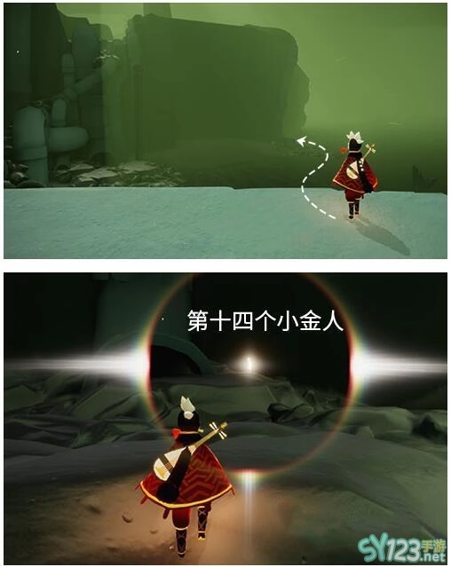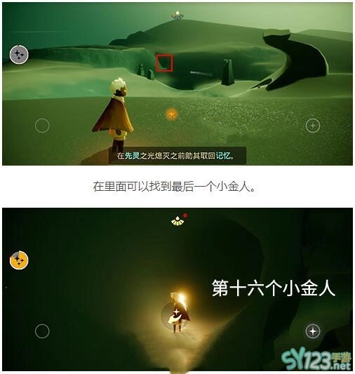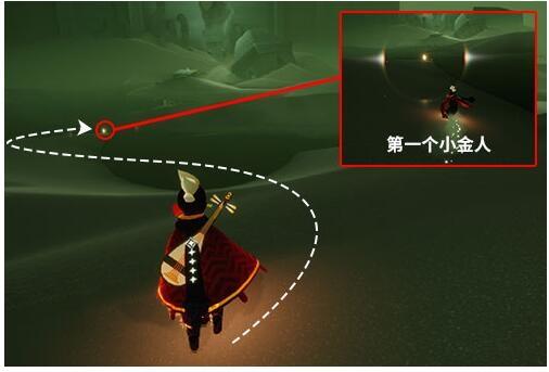 1、第一个小金人:进入墓土后,冲下去后,可以看到远处沙滩黑水旁有一个小金人。