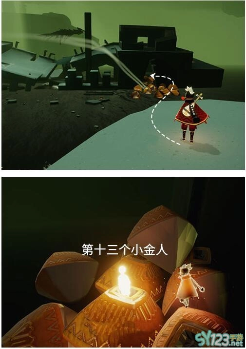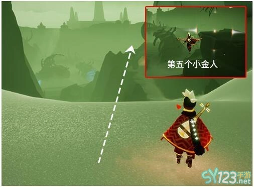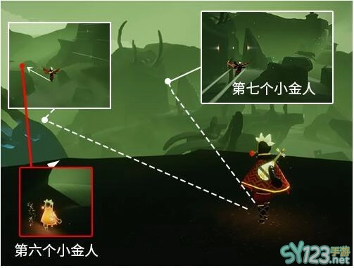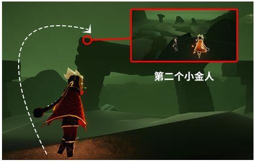 6、站在这个小金人平台这里,可以往左边飞行,可以在一个小洞穴里面, 找到第六个小金人,然后在这个右边的地方,然后找到第七个小金人。