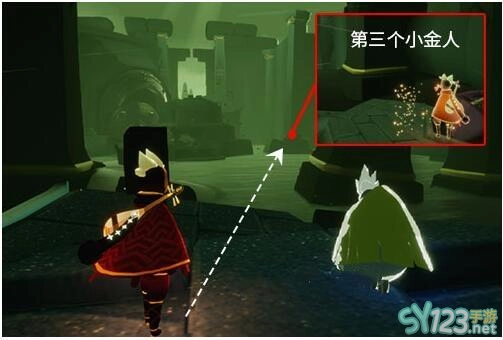 4、在进入第三场景的拱门右边夹缝中有一个小金人,如图。