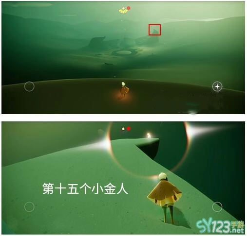 5、进入第三场景后,往右边飞去,在石头平台上有一个小金人,如图。