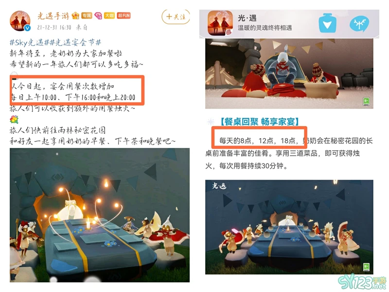 光遇雨林奶奶吃饭的时间是8点、12点、18点,2021年12月31日起官方宣布增加用餐次数,此后雨林老奶奶的吃饭时间增加为8点、10点、12点、16点、18点、20点,玩家可以在吃饭时间到雨林奶奶所在的秘密花园用餐获得烛火。
