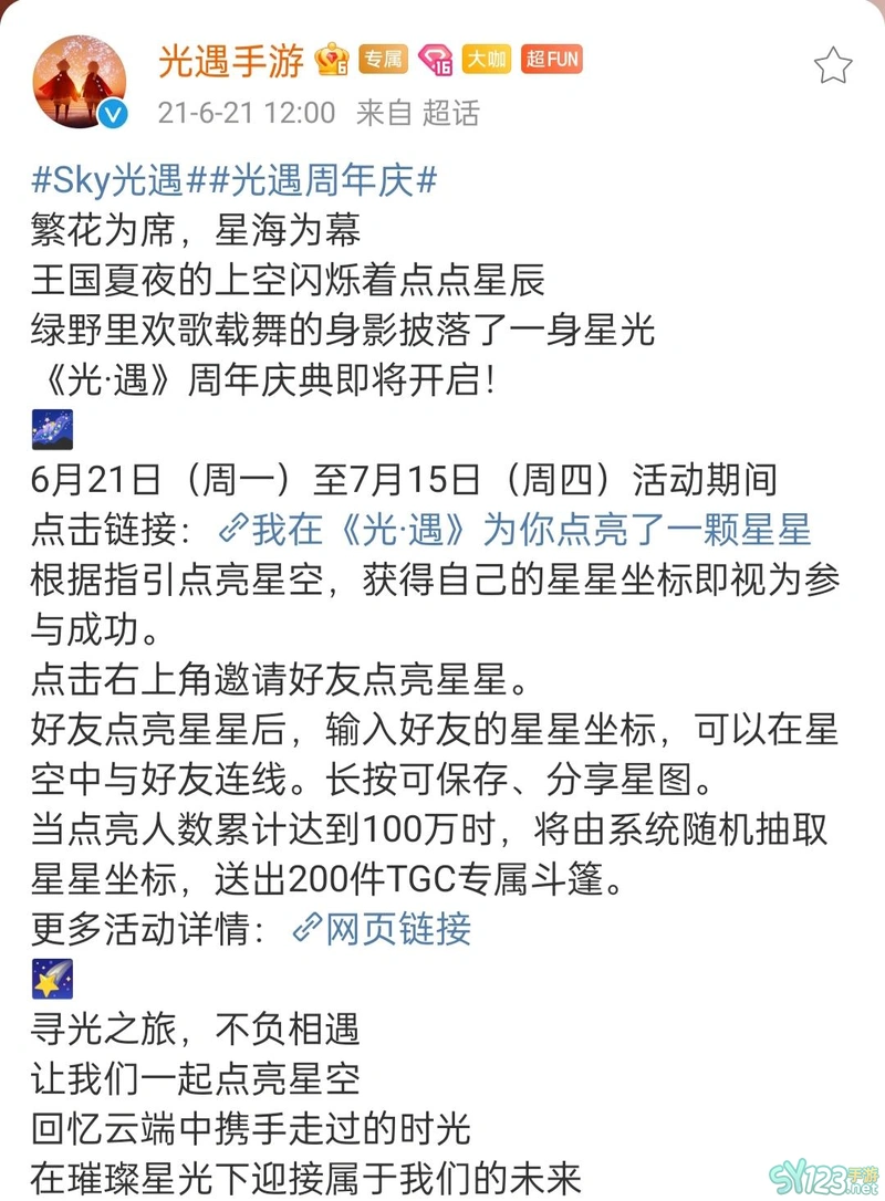 在2021年,光遇国服在6月21日上线了周年庆活动,在7月15日结束活动!玩家通过蜡烛兑换到心仪的周年庆物品。而在2022年,预计也会在同一时间上线周年庆活动!因此,光遇三周年活动预计在7月15日左右结束!