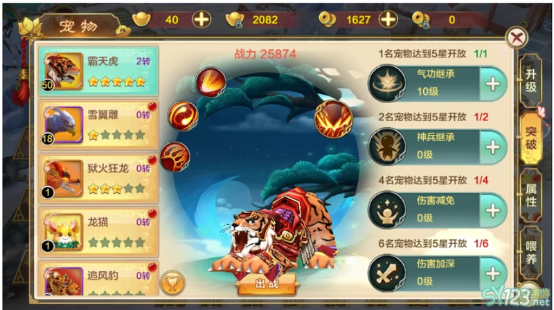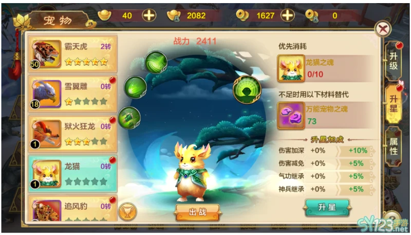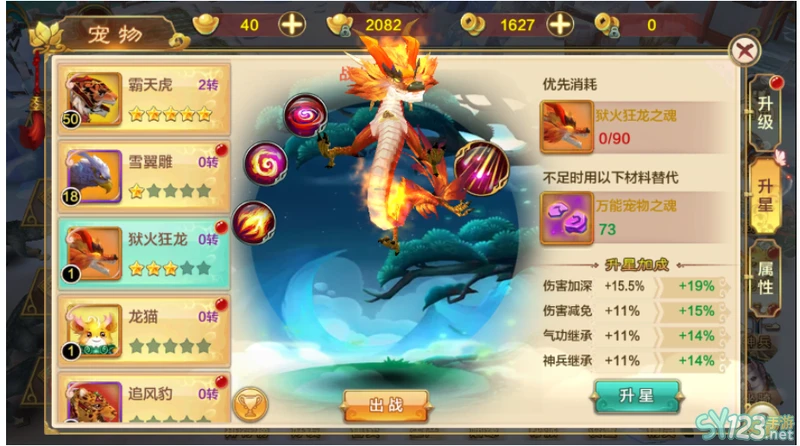 3、升星后,宠物会获得额外的伤害加成,伤害减免,气功继承,神兵继承。