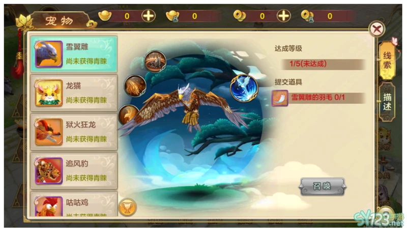 1、雪翼雕:主线任务获得:雪翼雕是玩家可获得的第一个宠物,进入游戏跟随主线做任务就能获得。特点是三维都不错,输出也给力,技能控制多,定身,击飞,眩晕拖拽。如果你是弓手或者医生,这个初始随用会更加适合,无论在风筝野怪还是以后的竞技场都十分实用。