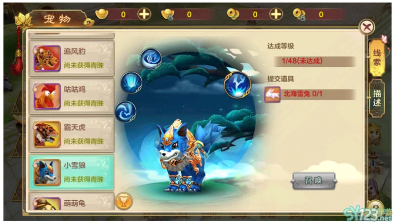 4、小雪狼:达成<强化达人5>获得:小雪狼也是游戏中的一个辅助型宠物,技能有着回复怒气,减少武功冷却的效果,终极技能除了大范围攻击外,还附带2.5秒的定身效果。由于增加怒气技能的存在,小雪狼可以很快的攒满怒气条,更频繁的释放终极技能。在刷副本和PVP中都是非常实用的!