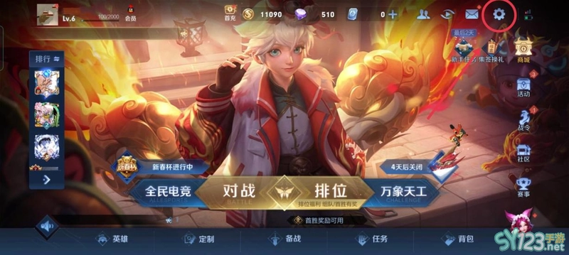 1、王者荣耀区排名前100标志显示很简单,先点击右上角的设置。