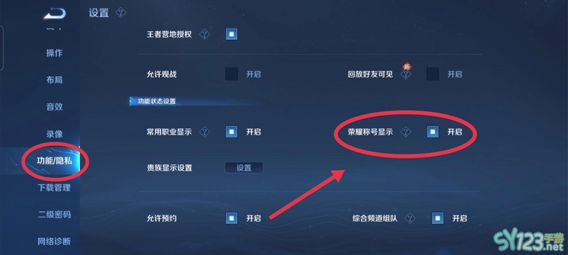 2、点击设置里的功能/隐私,开启荣耀称号显示。