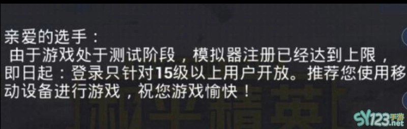 目前和平精英模拟器注册已答上限并且模拟器对登录也有一定的限制,目前在模拟器上仅支持15级及以上的账号进行登录,可以在手机上新创账号练至15级后再在模拟器上进行登录。