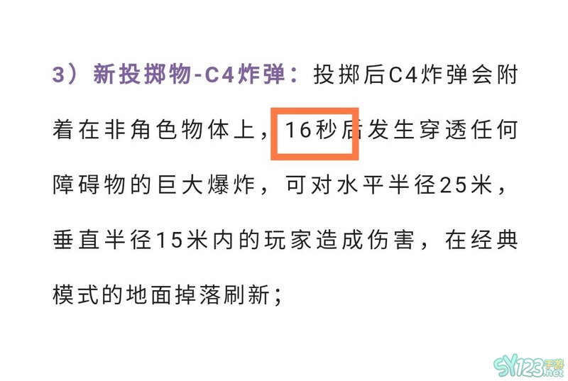 16秒。C4炸弹在投掷后会附着在非角色物体上,16秒后发生穿透任何障碍物的巨大爆炸,可对水平半径25米,垂直半径15米内的玩家造成伤害,在经典模式的地面掉落刷新。