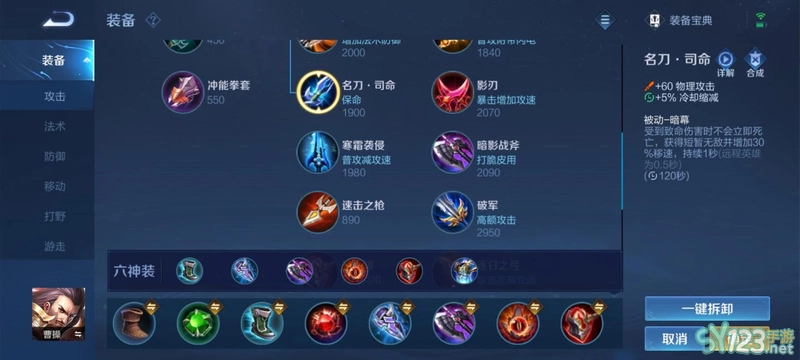 四,实战中出装顺序,进入到游戏中出门先买个草鞋,然后再买个提神水晶,接着把鞋子升级到抵抗之鞋,然后在出半件暗影战斧,接着出个冰痕之握,再然后将暗影战斧补全;这个时候如果觉得对方的C位伤害过高的话,可以先出一个不死鸟之眼,再补全暗影战斧,然后再出个破星锤,最后补一件贤者的庇佑,在实战中贤者的庇~佑处于CD时就换成血魔、名刀换着来用。佑处于CD时就换成血魔、名刀换着来用。