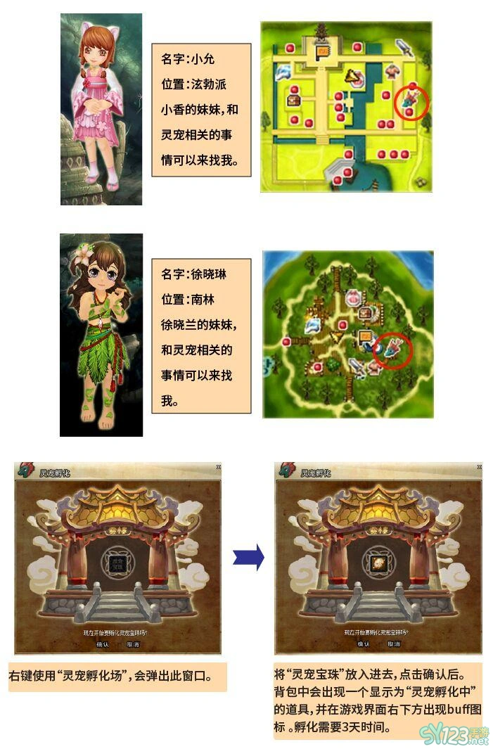 热血江湖获得了灵宠宝珠后,就可以准备进行孵化灵宠了。在灵宠NPC(泫勃派-小允)或(南林-徐晓琳)处购买“灵宠孵化场”道具,对灵宠宝珠进行孵化。孵化灵宠需要3天时间,同一时间只能进行孵化一只灵宠,NPC位置如下图所示。