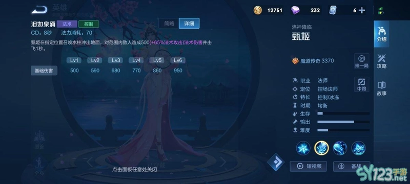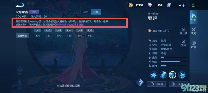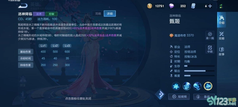 1、甄姬是控制型的法师英雄,起手二技能叹息水流可以多次弹射,能加快甄姬的消耗能力。