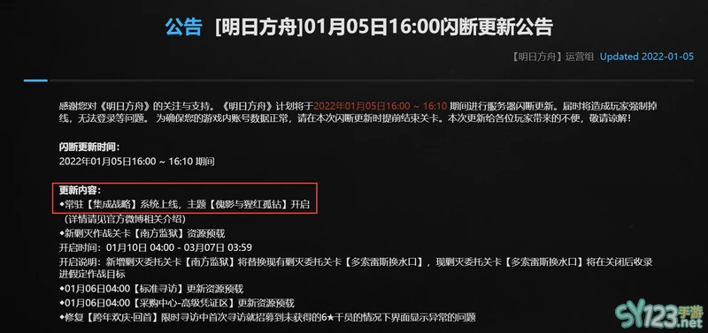 在明日方舟游戏中,主题活动【傀影与猩红孤钻】在2022年1月5日闪断更新后开启。闪断更新时间为16:00~16:10,更新完成后玩家即可上线体验。