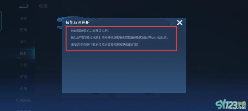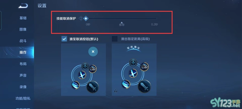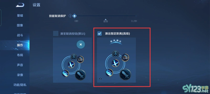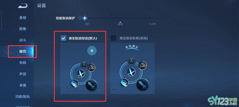 2、点击操作设置,若勾选滑至取消按钮,则在对局内只需要将技能滑到叉号内即可取消施放。
