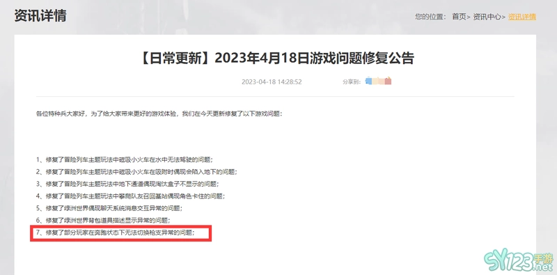 和平精英中部分玩家在奔跑状态下无法切换枪支是因为官方服务器bug导致的,该问题已经于2023年4月18日进行修复。