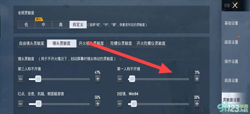 2、设置灵敏度参数将第三人称不开镜设为47,第一人称不开镜设置为21,这样压枪最稳了。