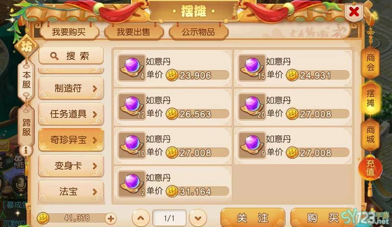 如意丹不同的区有不同的价格。在摆摊界面的“奇珍异宝”中可购买其他玩家出售的如意丹,我这个区它的价格在2.39万至3.1万不等。