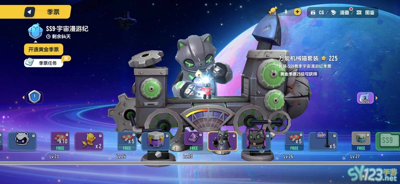 2、万能机械喵套装是ss9赛季手册二十五级即可拥有的套装奖励。