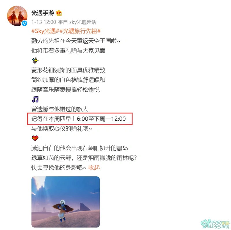 在光遇游戏中,玩家可以在1月13日6:00到1月17日12:00复刻白棉裤先祖。目前活动已经结束了,玩家可以等待下一次白棉裤先祖的复刻。