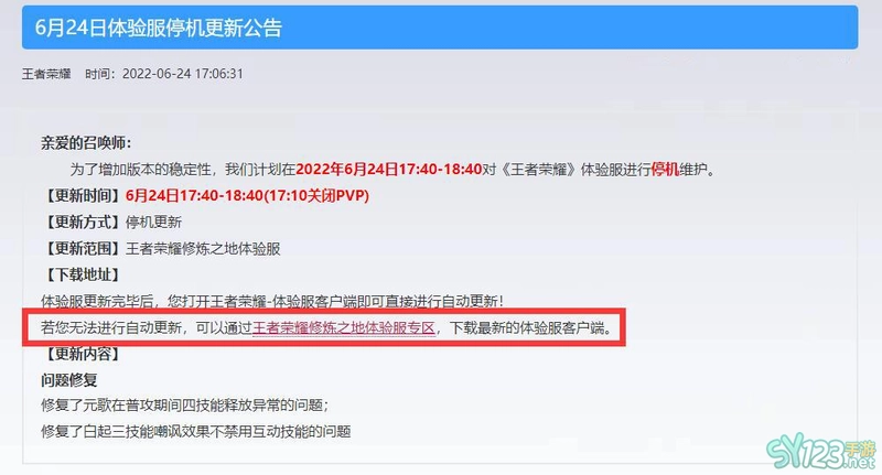 2、体验服如果遇到无法自动更新,可以通过王者荣耀修炼之地体验服专区,下载最新的体验服客户端。