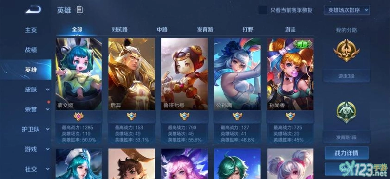 1.进入游戏大厅界面,点击界面左下角的英雄按钮,进入英雄界面,点击上面的定制攻略,点击上方的查看我的所有英雄,在查看英雄界面就会显示我当前战斗力。