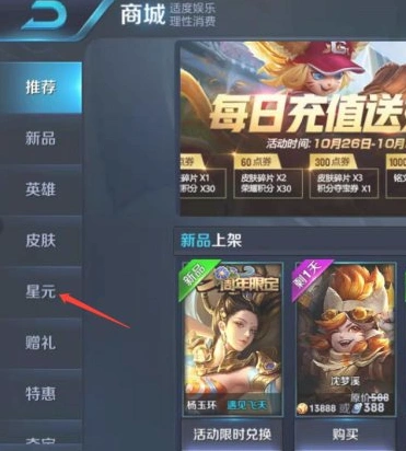 1.进入商城界面后,在左侧的导航栏中找到星元,点击打开,进入后在左侧点击紫星币专属,然后右边就会显示出可以用紫星币来兑换的物品了。