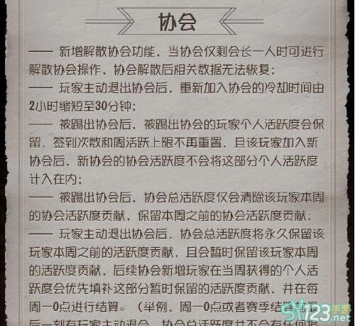 协会成员参与签到、日常战斗、五排赛可获得的个人活跃度,会转化为协会经验,可用来提升协会等级,等级越高可容纳协会成员数量越多;协会活跃度等于协会成员个人活跃度总和,赛季结束时,会根据协会活跃度给协会成员发放对应赛季协会奖励。