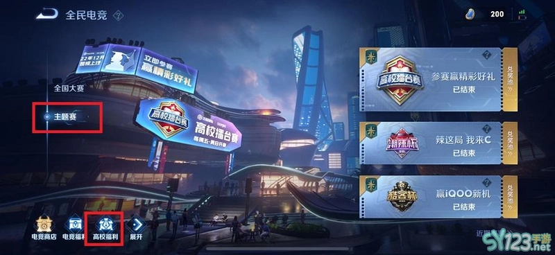 2.在全民电竞中找到“主题赛”,选择“高校福利”,点击进入。