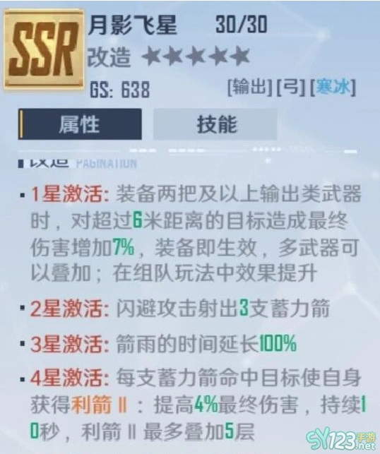 月影飞星是一把冰属性的远程武器,品质为SSR,样式为富有科技感的黑色长弓。