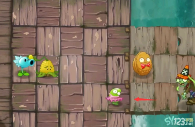 1、首先进入关卡 在第1排种植寒冰豌豆射手 在第一个僵尸来的路上种植弹簧豆 第2 3排种植玉米投手 在甲板上种植坚果墙(根据僵尸来的路线进行种植)
