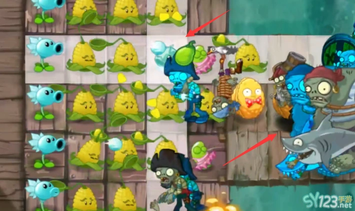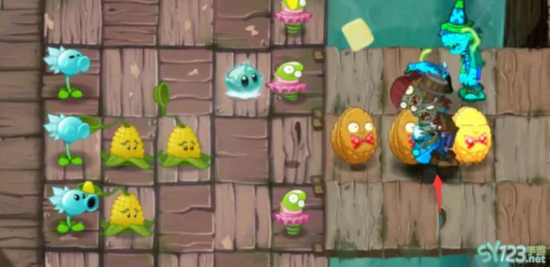 2、在僵尸比较多的一列 种植2-3个坚果墙以及2-3个玉米投手 来尽量延缓僵尸