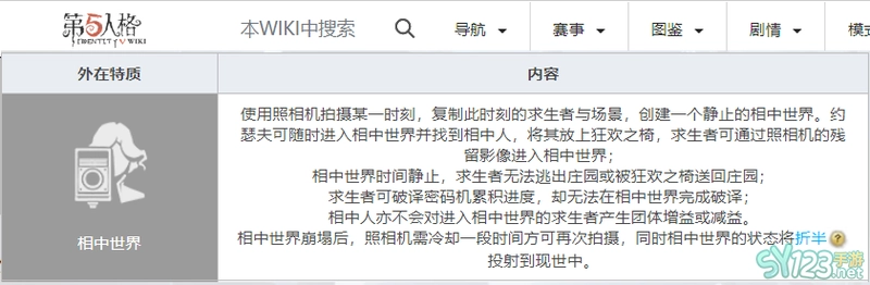 相中世界时间静止,求生者无法逃出庄园或被狂欢之椅送回庄园。求生者可破译密码机累积进度,却无法在相中世界完成破译。相中人亦不会对进入相中世界的求生者产生团体增益或减益。相中世界崩塌后,照相机需冷却一段时间方可再次拍摄,同时相中世界的状态将折半投射到现世中。