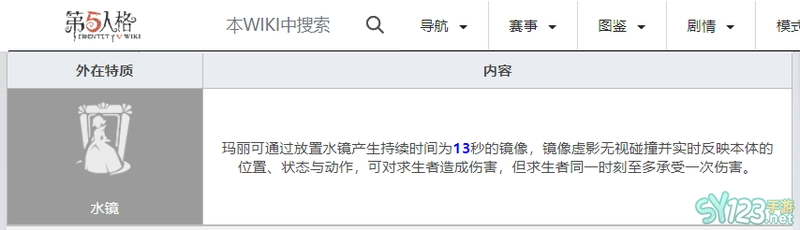红夫人的镜像技能具体描述:玛丽可通过放置水镜产生持续时间为13秒的镜像,镜像虚影无视碰撞并实时反映本体的位置、状态与动作,可对求生者造成伤害,但求生者同一时刻至多承受一次伤害。
