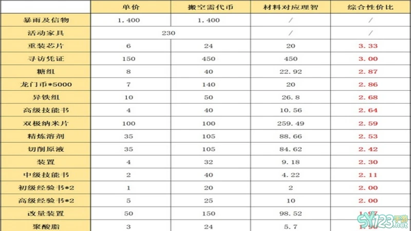 推荐兑换的材料性价比排序如下:重装芯片、寻访凭证、糖组、龙门币5000、异铁组、技能书、双极纳米片、精炼溶剂、切削原液、装置、中级技能书、初级经验书2、经验书2、改量装置等等。大家依照上表顺序依次兑换即可,也可以根据自己的需要进行调整。