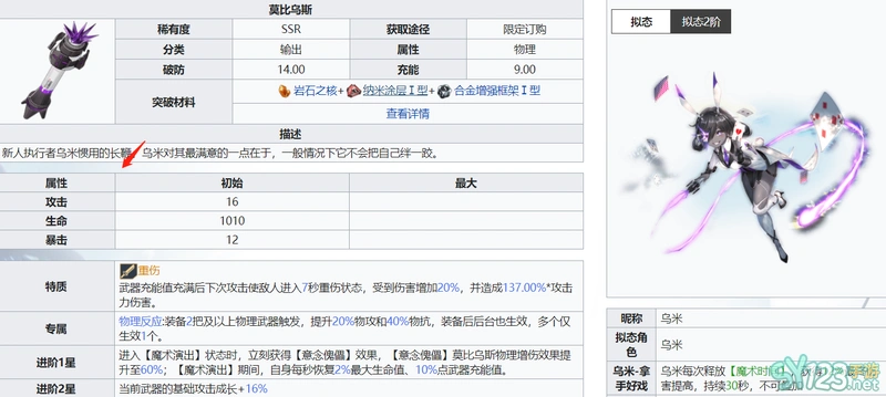 游戏中的乌米就是莫比乌斯,莫比乌斯的属性攻击16生命1010暴击12,莫比乌斯的物理反应:装备2把及以上物理武器触发,提升20%物攻和40%物抗,装备后后台也生效,多个仅生效1个。