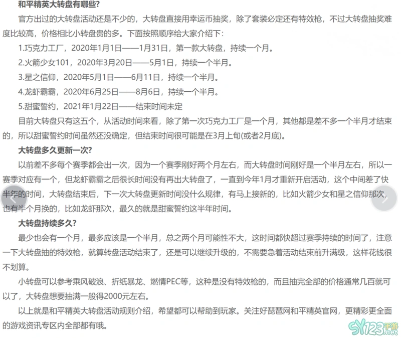 在游戏和平精英中差不多每个赛季都会出一次大转盘,因为一个赛季刚好两个月左右,除了第一次巧克力工厂的大转盘是一个月,其他都是差不多一个半月才结束,所以一赛季对应有一个转盘活动,差不多大转盘两个月左右更新一次。
