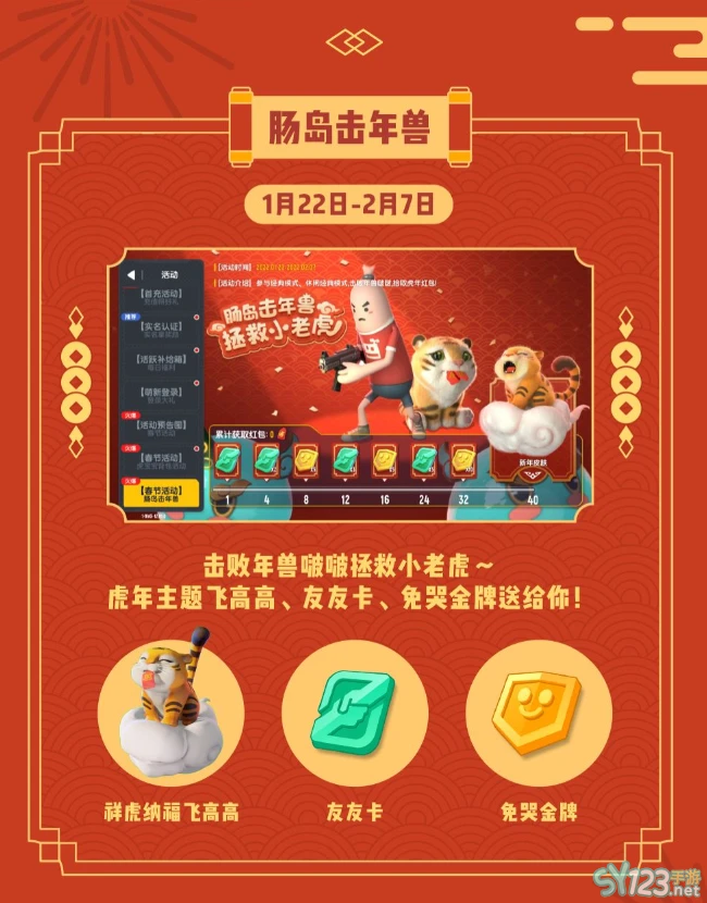 1、香肠派对的“肠岛击年兽活动”,参与经典模式【彩虹岛、战斗岛】,击败年兽啵啵,拾取虎年红包。活动时间:2022年1月22日-2022年2月7日。