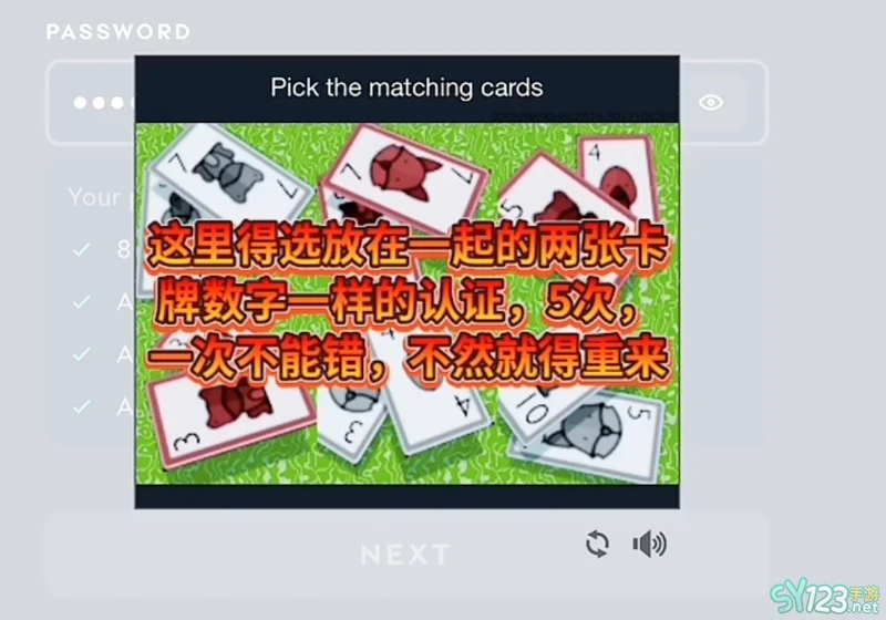 7、进入测试界面后,需要选择放在一起的两张数字一样的牌,一共五次,全部选对后才可进入下一步