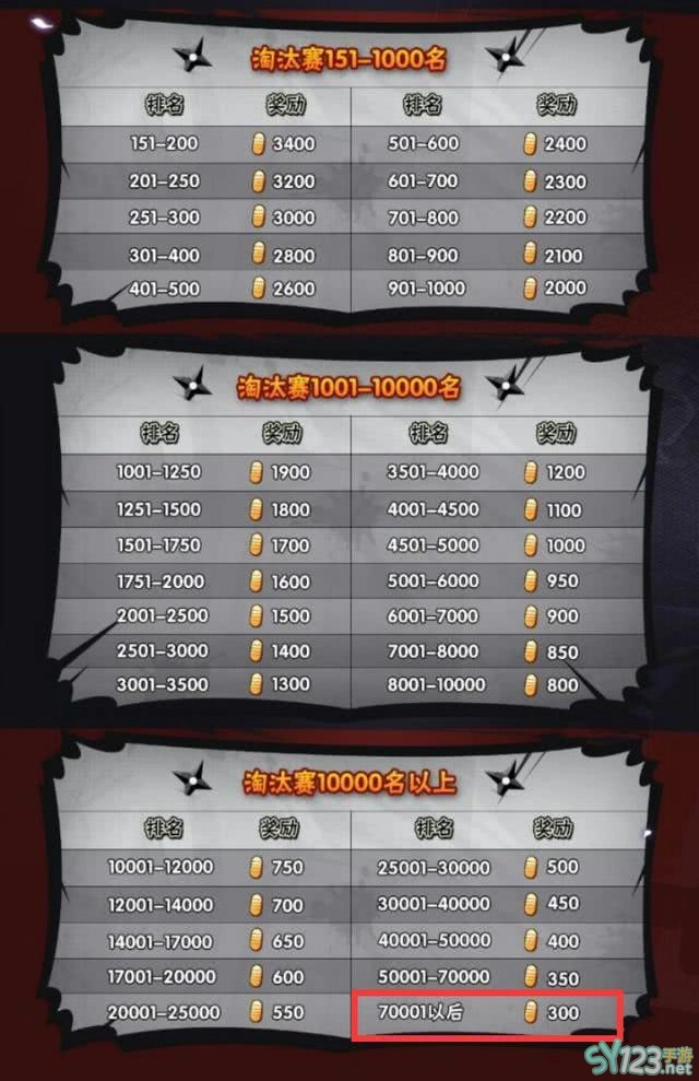 1.火影忍者手游第十五届无差别第二轮淘汰赛昨天已经开启,如果你之前在第一轮海选赛达到要求的话就可以直接进入到第二轮的淘汰赛中,而淘汰赛的奖励并不是跟之前海选赛一样是固定的300金币,他是会根据你的排名高低来发放金币的,最高的第一名是会有10000金币的奖励,但对于普通玩家来说,这个名次的角逐还是极其困难的,但也不要灰心,后面排名的奖励也异常丰厚,下图就是无差别淘汰赛前150名的奖励情况。
