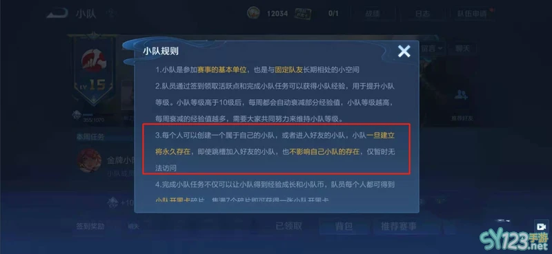 3.在小队规则第三条,小队创建成功后是不能解散的,但是可以脱离自己创建的小队。