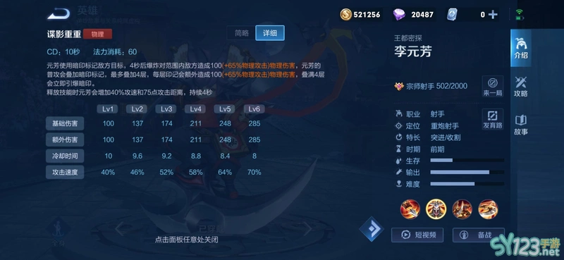 在王者荣耀中,李元芳的一技能名为谍影重重,元芳在使用一技能标记目标后,在4秒后会立刻爆炸,而元芳的普攻会叠加暗印标记,最多可以叠加4层,叠满4层后会立即引爆。