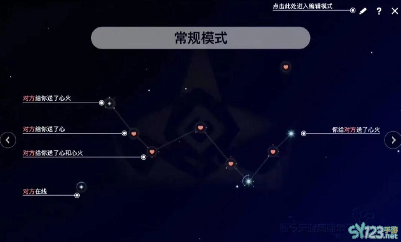 1、首先更新后的星盘会有两种模式,直接进入就是常规模式,点击好友星星即可出现好友形象,当好友星星上有散落的星火就表示对方向你赠送了星火,当星星上出现爱心就表示对方赠送了爱心,当星星周围有蓝色光圈转动就表示好友在线,星星散发蓝色光芒就表示今日已经向对方赠送了星火。