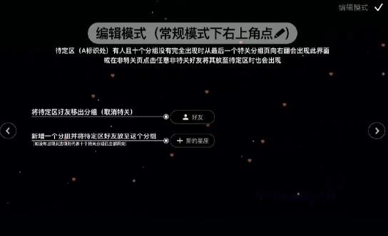 2、点击星盘右上角铅笔标志,即可进入编辑模式,在这个模式中可以点击好友星星,把他移动到西昂岛以东的星盘页面,进行星盘分组。
