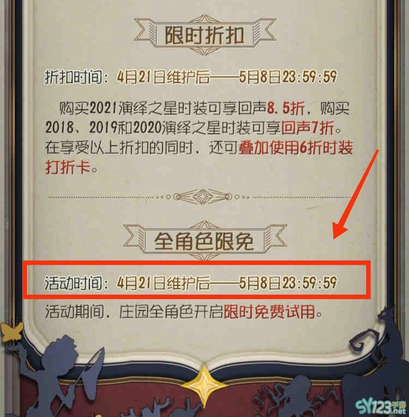 第五人格四周年全角色限免活动时间是在4月21维护后至5月8日23:59,在活动期间,园丁、医生以及祭司等全角色开启免费试用,玩家们不要错过哦。
