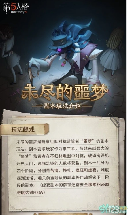 1、未尽的噩梦玩法简介:未尽的整梦是玩家组队对抗监管者“噩梦”的副本玩法,副本要求玩家作为求生者,与越来越强大的“噩梦”监管者在不归林地图中对抗,破译密码机开启大门,逃脱足够的人数将获胜。副本一共分为四个阶段,分别是苦痛,挣扎,疯狂和虚妄,难度逐渐递增,通关前置阶段的副本将自动解锁下一阶段的副本。