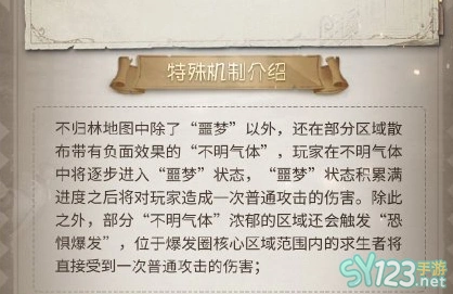 2、机制介绍:在该地图的部分区域散布着带有负面效果的“不明气体”,在这个气体中玩家们会渐渐进入“噩梦”状态。在这个状态下如果积累满进度之后会受到一次普通攻击。部分“不明气体”浓郁的区域还会触发“恐惧爆发”,位于爆发圈核心区域范围内的求生者将直接受到一次普通攻击的伤害。