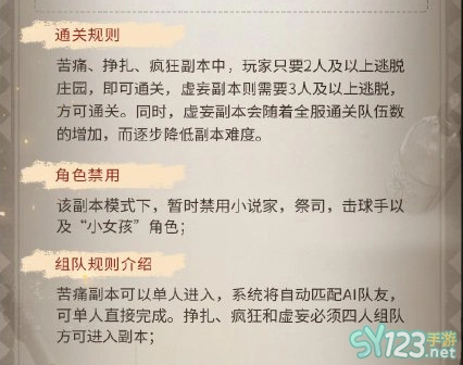 3、通关规则:在苦痛、挣扎、疯狂这三个副本中,只有有两人以上逃脱就算通关成功。二虚妄副本需要3人及以上都逃脱才算成功。当全服通关队伍增加,那么虚妄副本的难度会逐步降低。