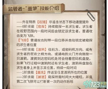 4、监管者-“噩梦”技能介绍如下图所示,分别是寻猎、窥探、飞掠、渡鸦、噩兆和捕猎。