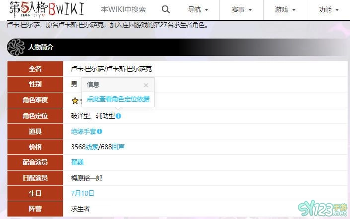囚徒”的配音演员是翟巍,日配演员是梅原裕一郎。卢卡·巴尔萨,原名卢卡斯·巴尔萨克,加入庄园游戏的第27名求生者角色。角色定位破译型、辅助型。